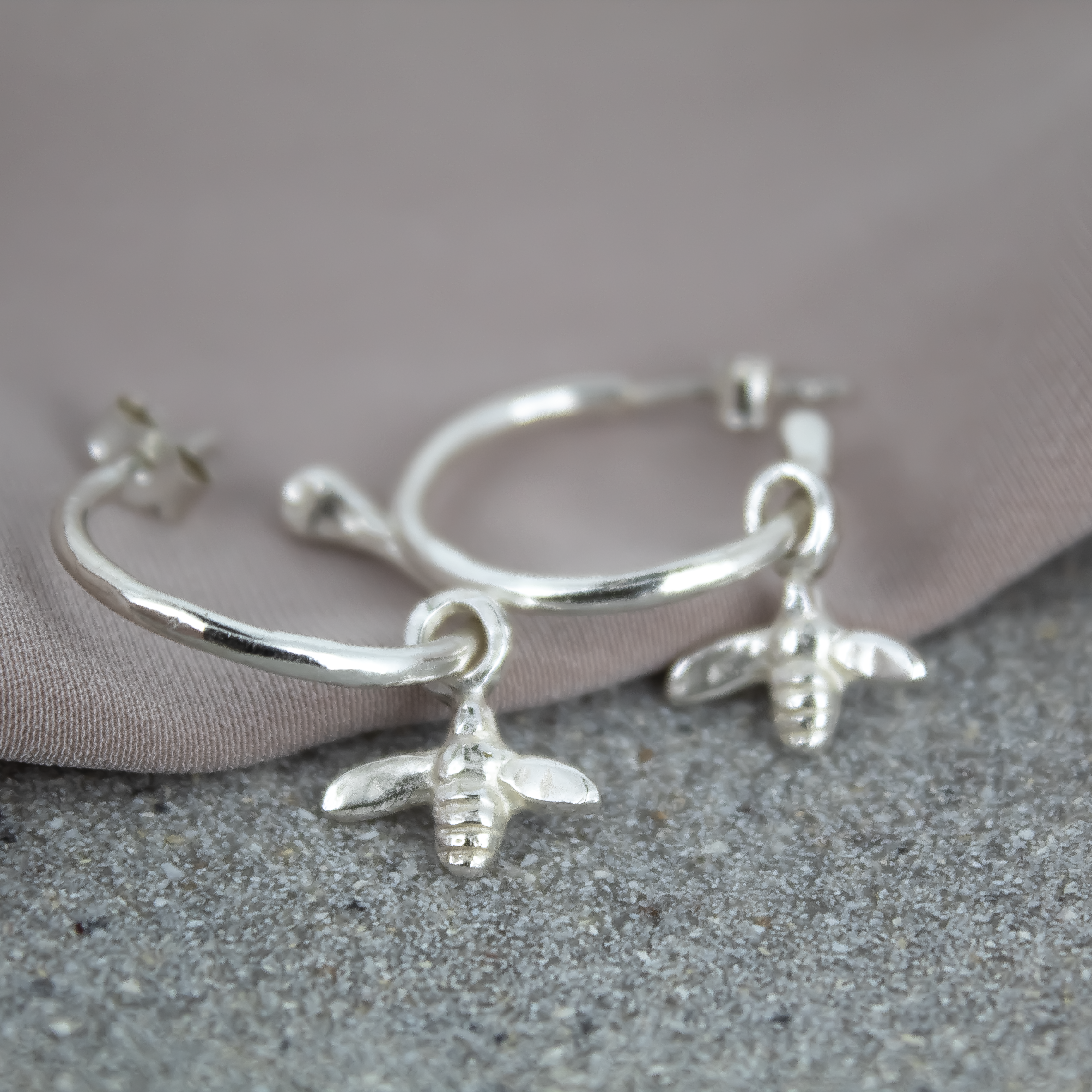 Our most popular honey been charm on our classic hoops all handmade in sterling silver