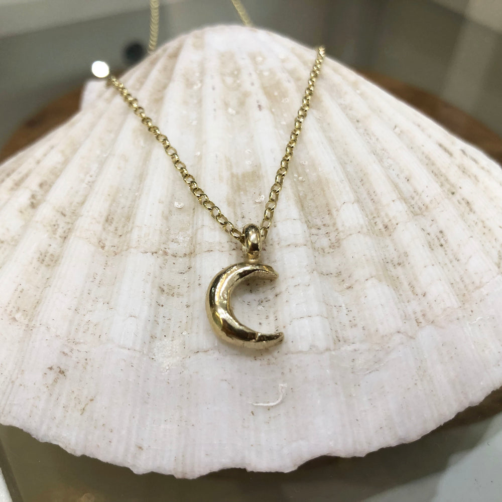 Our beautiful crescent moon charm in 9ct gold, strung on a 18 inch chain in solid 9ct gold.