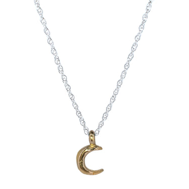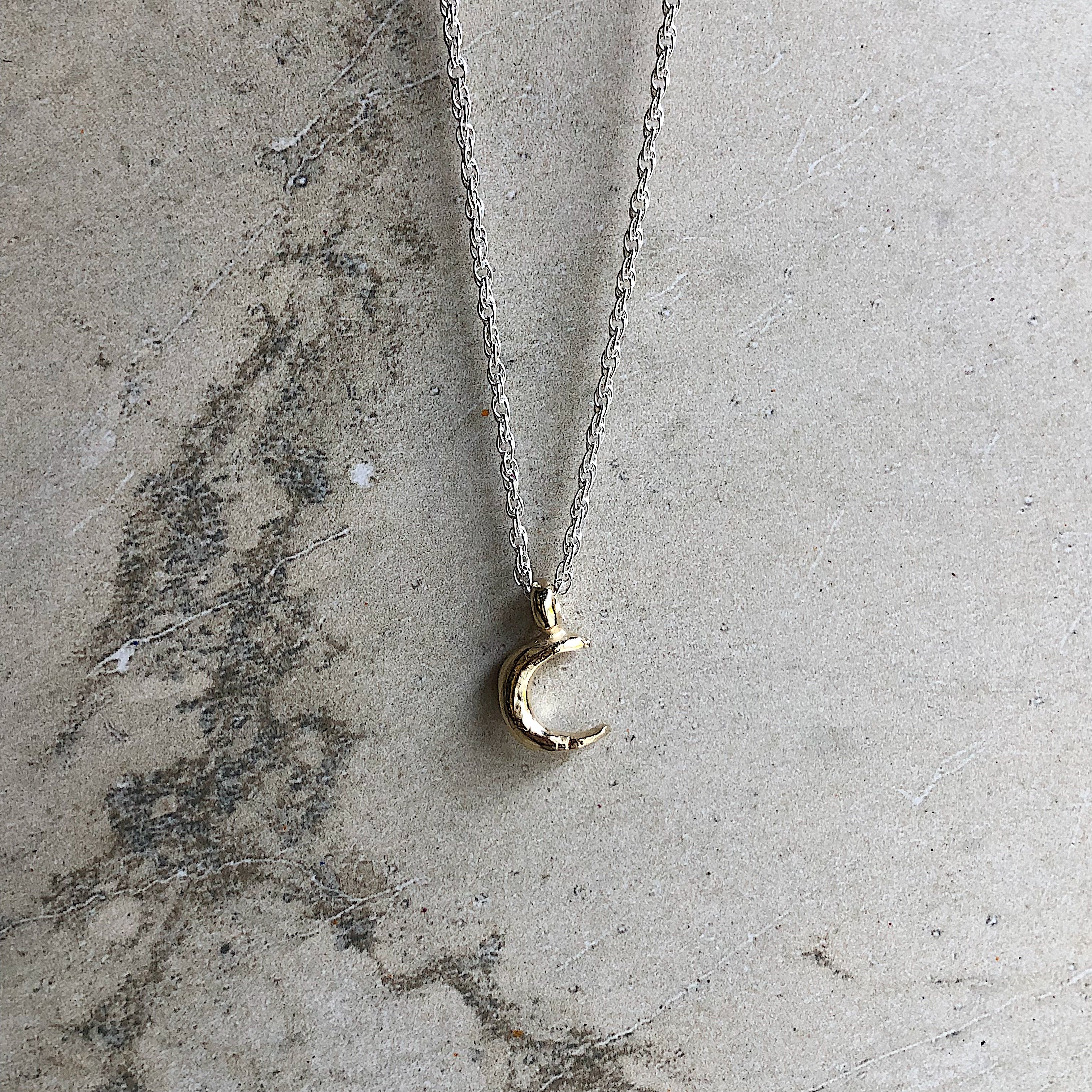 All lovingly made by hand using recycled solid 925 Sterling Silver and 9ct Gold. A beautiful piece to be worn alone or layered with other staple pieces. Our crescent moon charm in 9ct gold on a sterling silver rope chain.