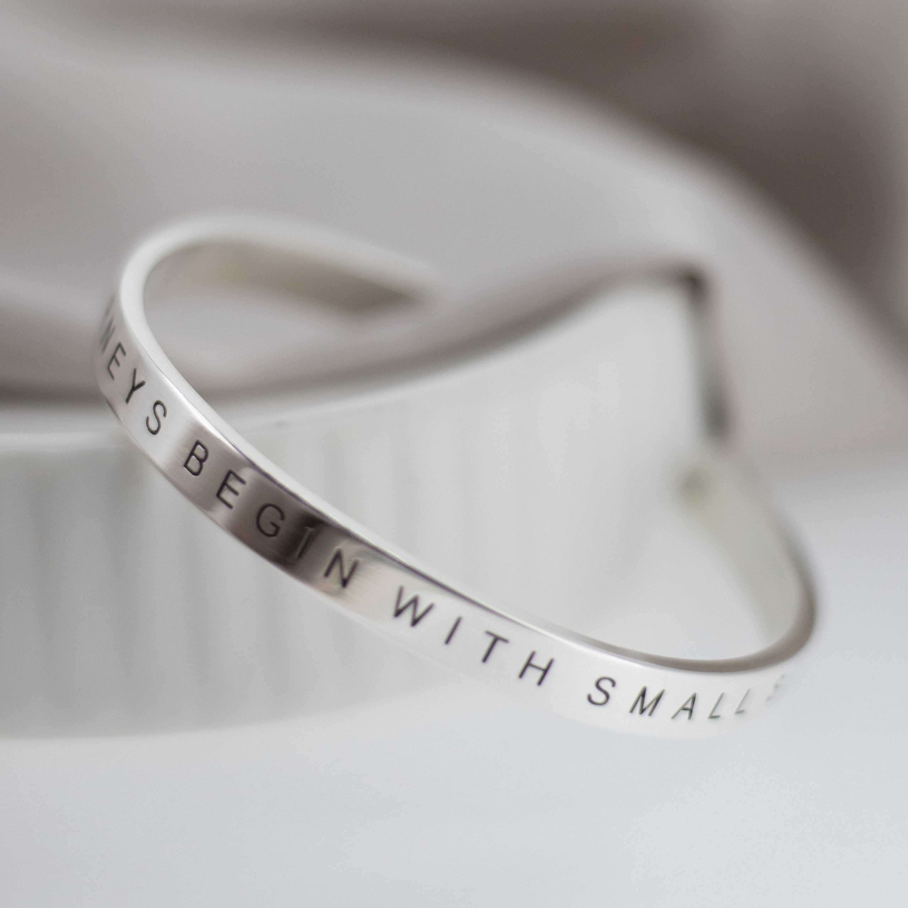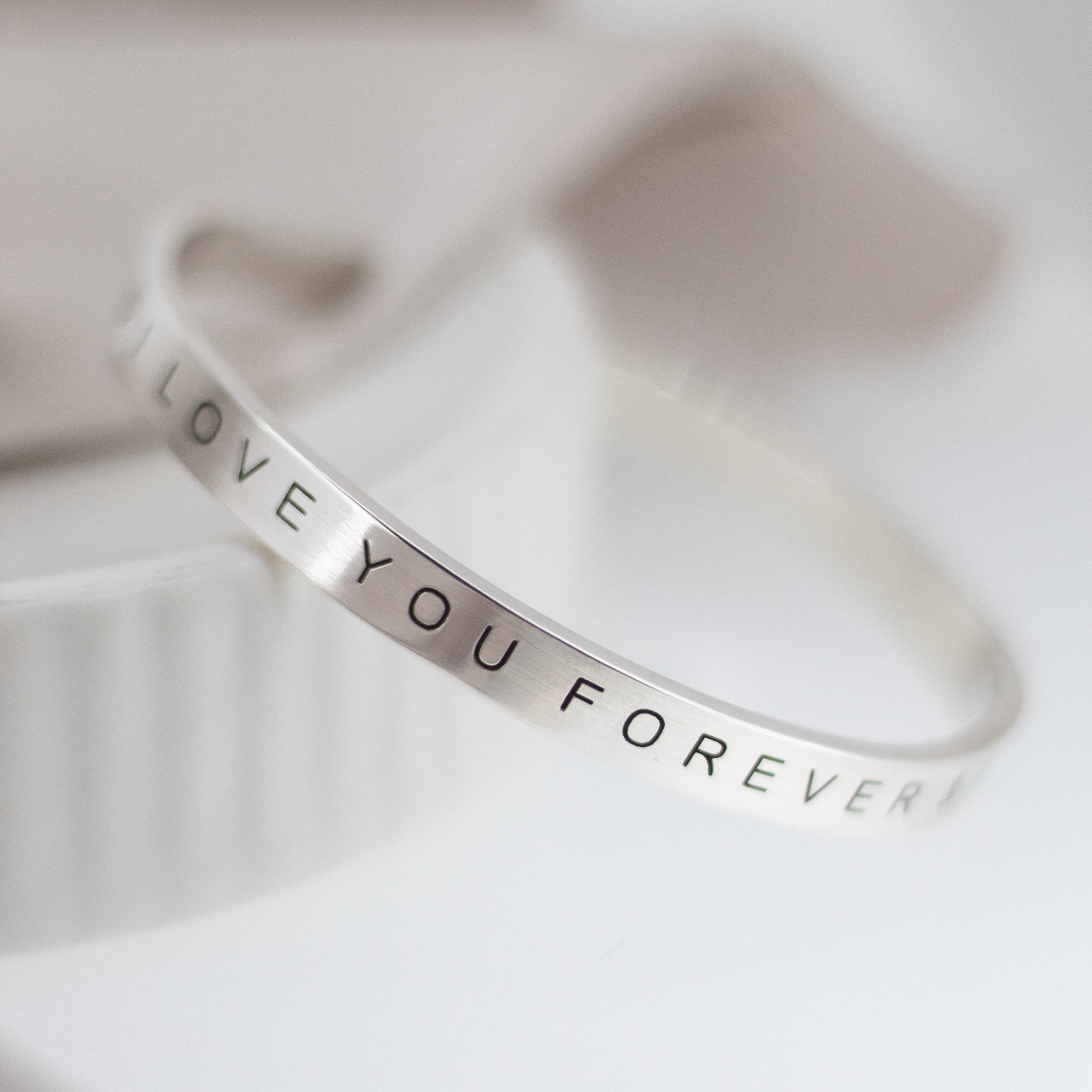 Create your story on our personalised cuff bangle made from solid sterling 925 silver. Express yourself with a sentimental quote or message upto 35 characters long including spaces on each side.