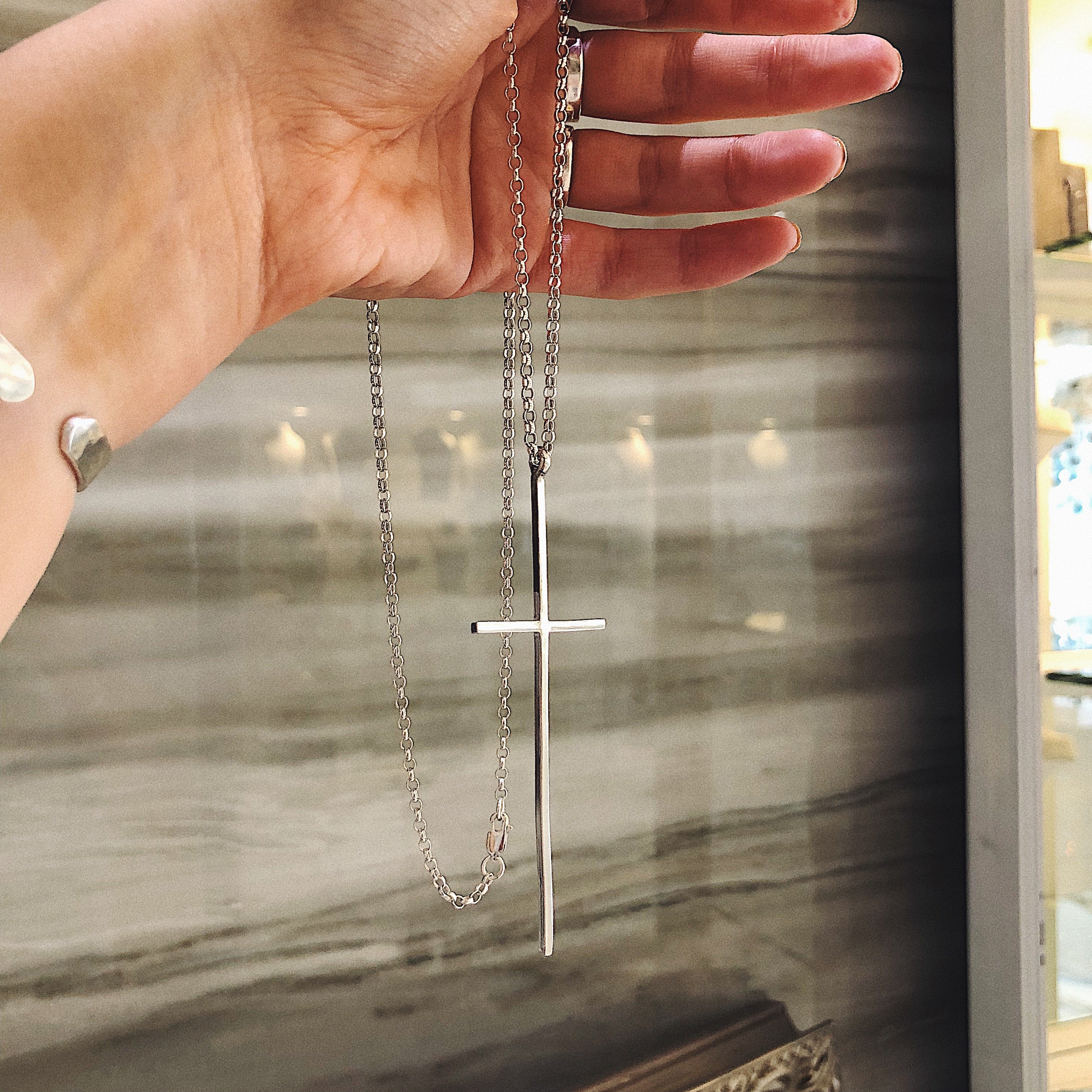 Large sterling silver cross on an adjustable 22 or 24 inch chain.