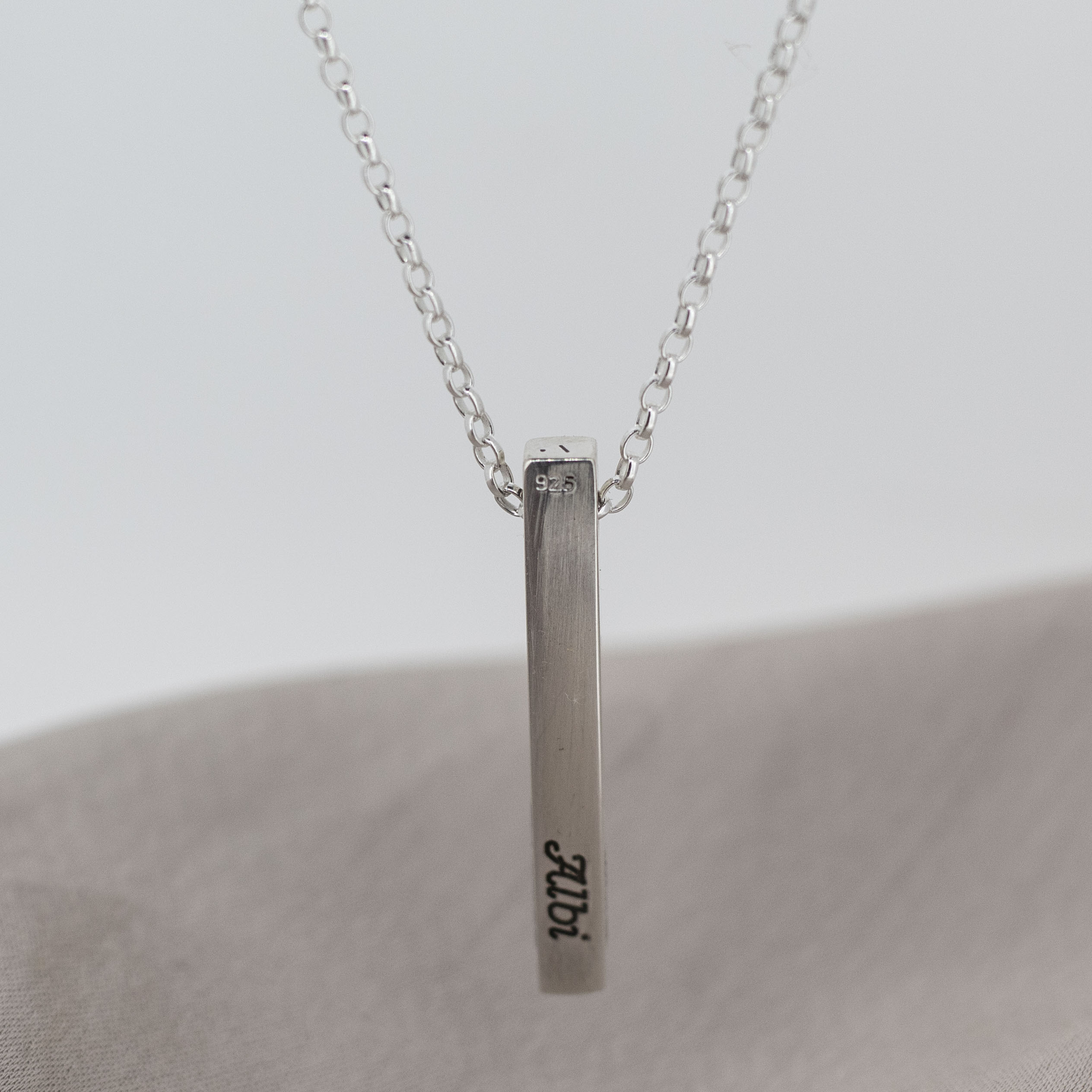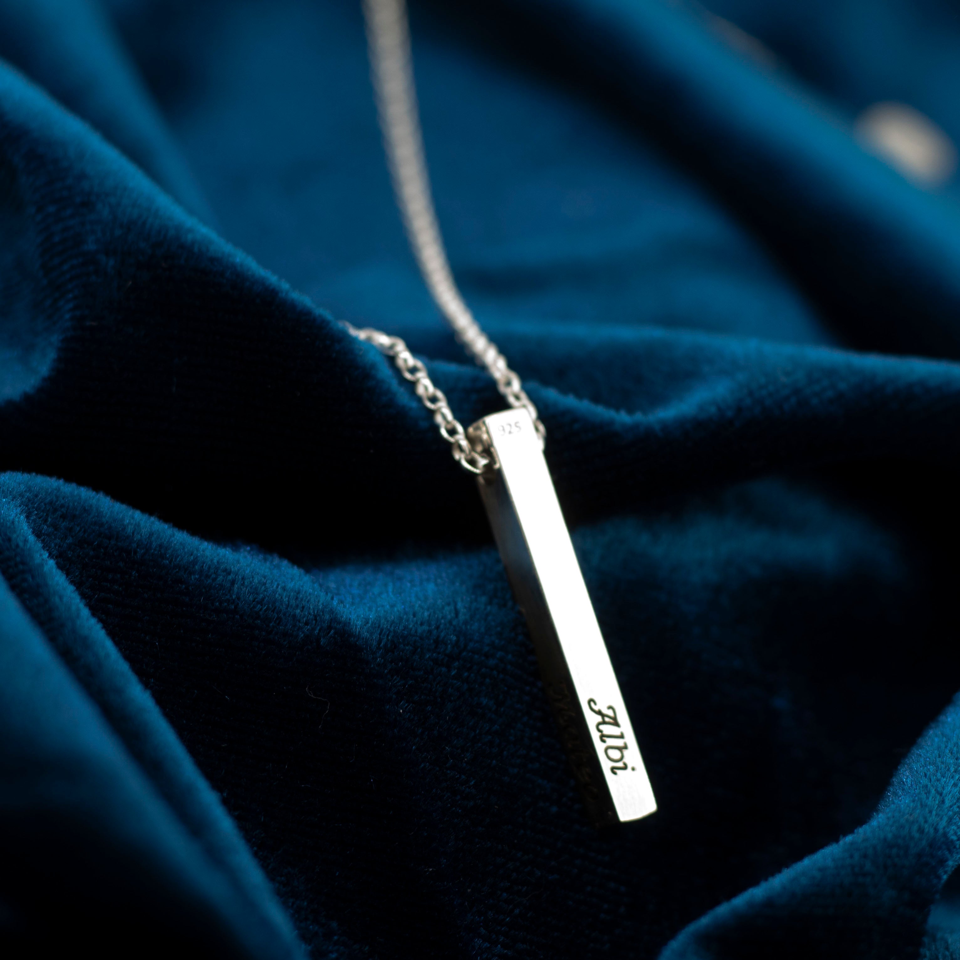 Our Unisex Drop Bar Necklace is a new addition to our range. A personalised piece to treasure forever. The bars can be engraved with upto 4 names or words - one on each face of the solid silver bar.