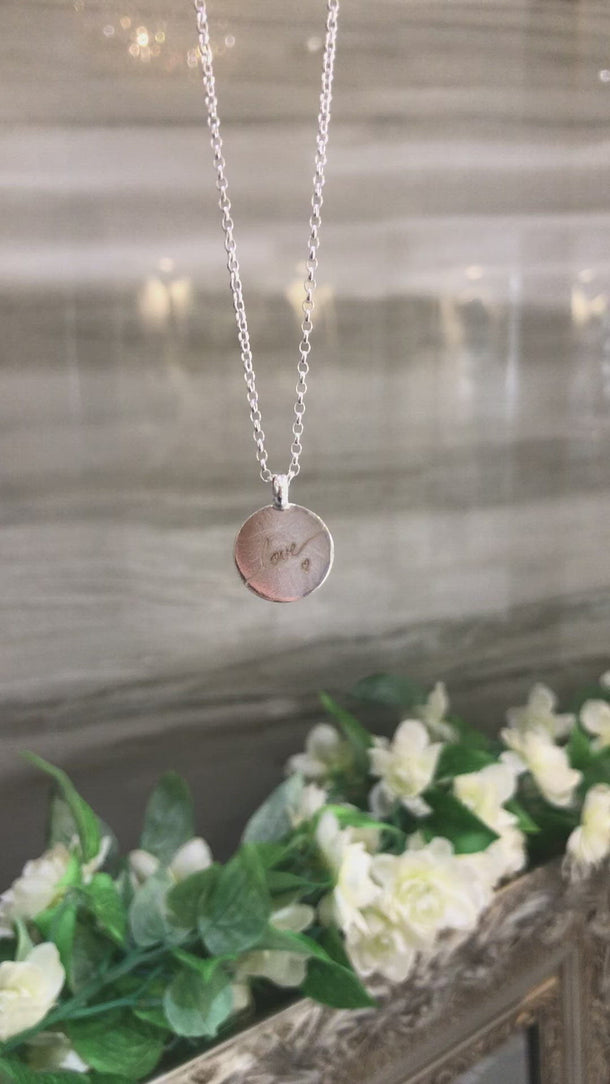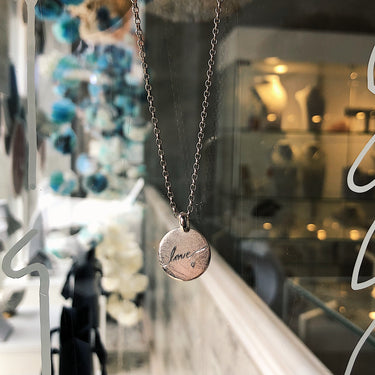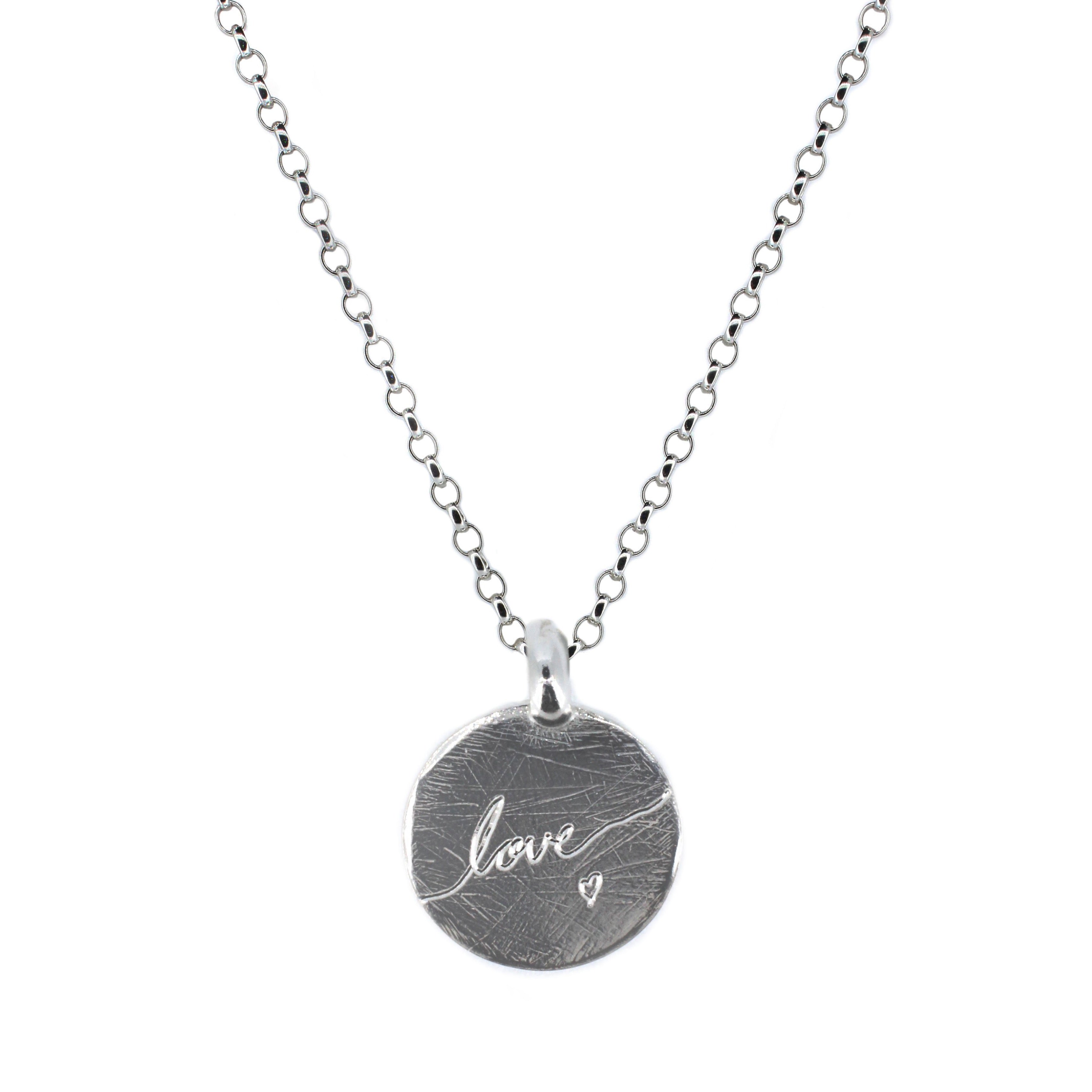 "love" engraved disc handmade in sterling silver. Or, a word of your choice! Just add into the note section.