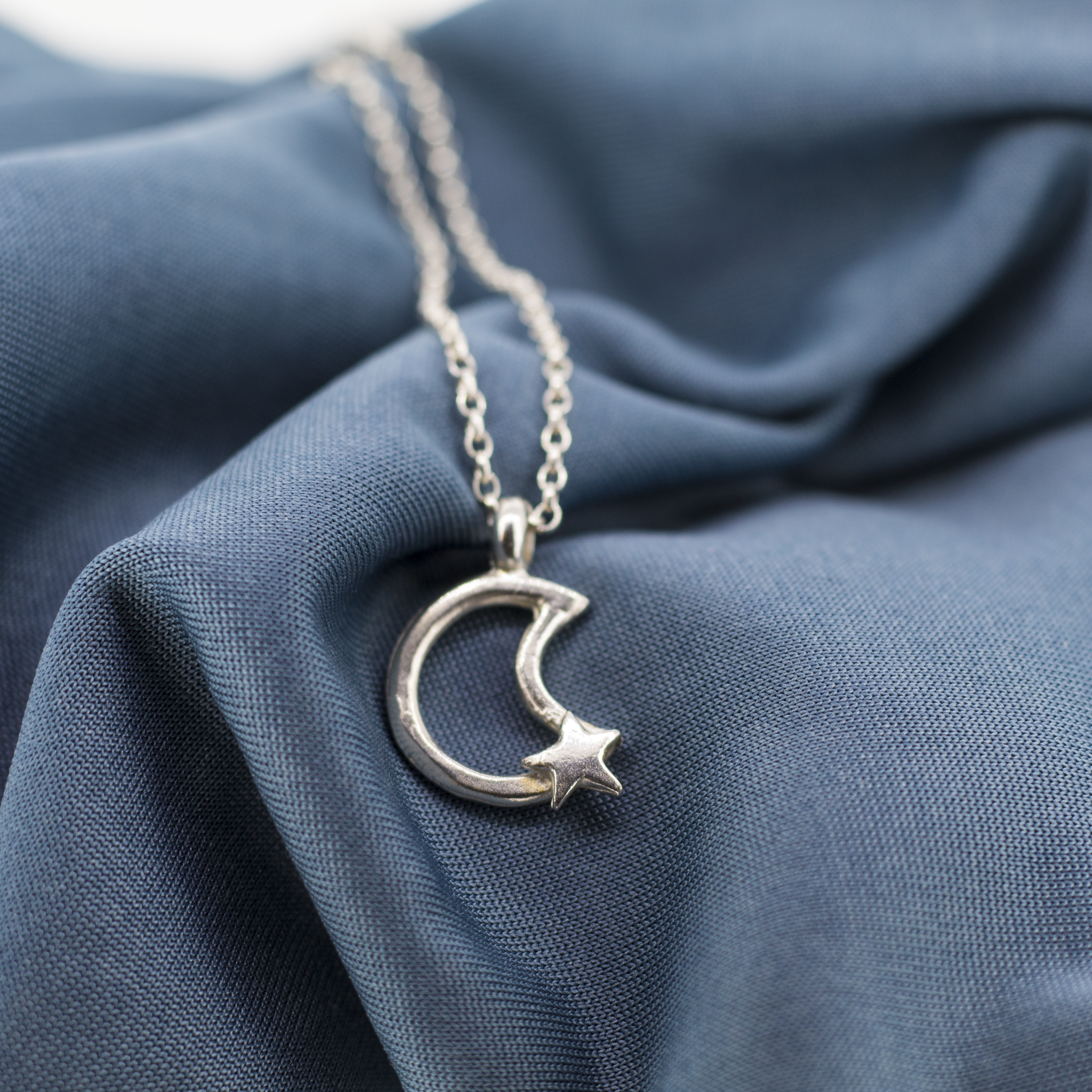 This pretty little moon and star charm has been handmade in sterling silver and comes on a standard 18inch chain. Other lengths are available.