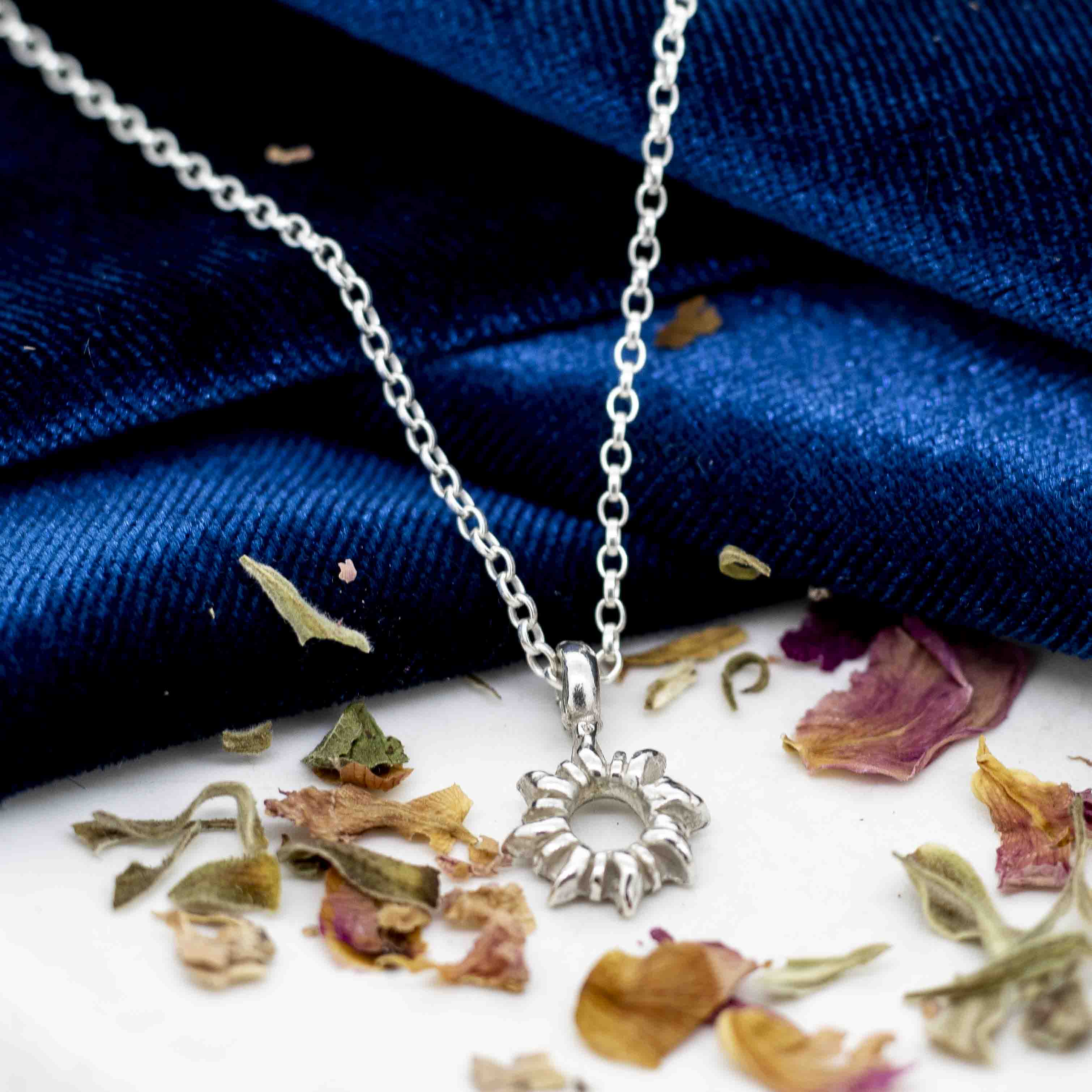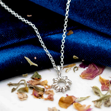 This handmade sterling silver talisman captures the radiant energy of sunflower in its striking burst design. A holistic piece that serves as both a meaningful accessory and a symbol of vitality, available in multiple lengths to suit your individual preference.