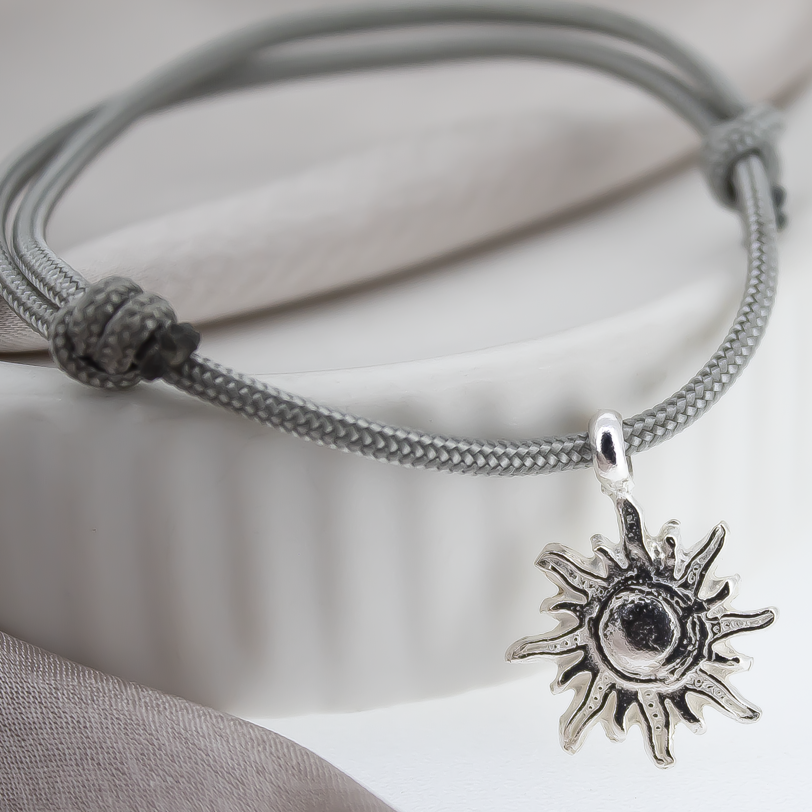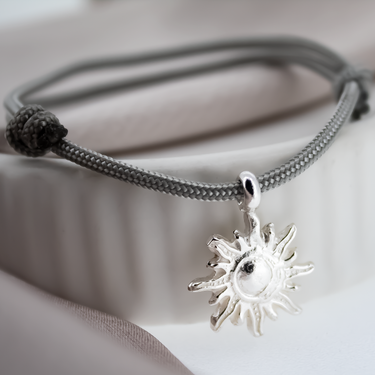 Our beautiful sun of hope charm in sterling silver strung on a rope colour of your choice. The sun of hope charm is a symbol of gratitude and warmth. Please add rope colour in the note section. Light Grey will automatically be used if there is no note for an alternative colour.