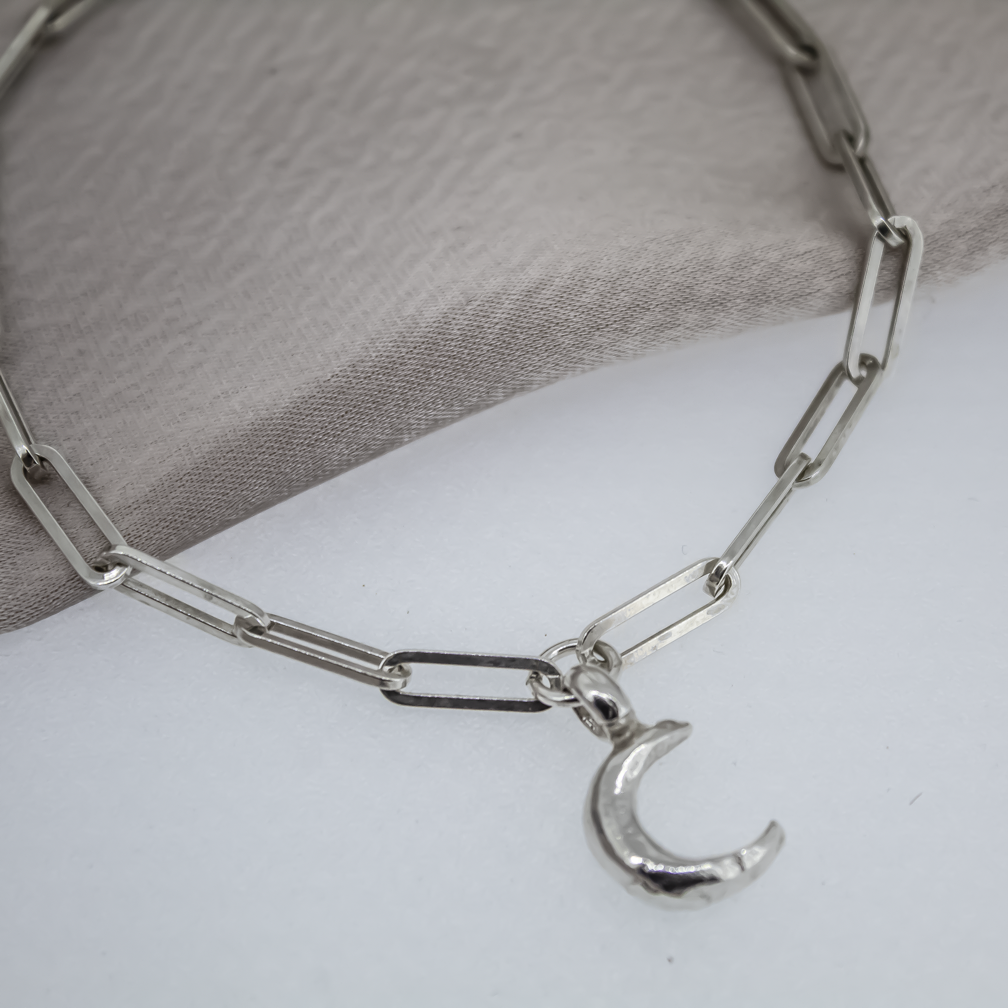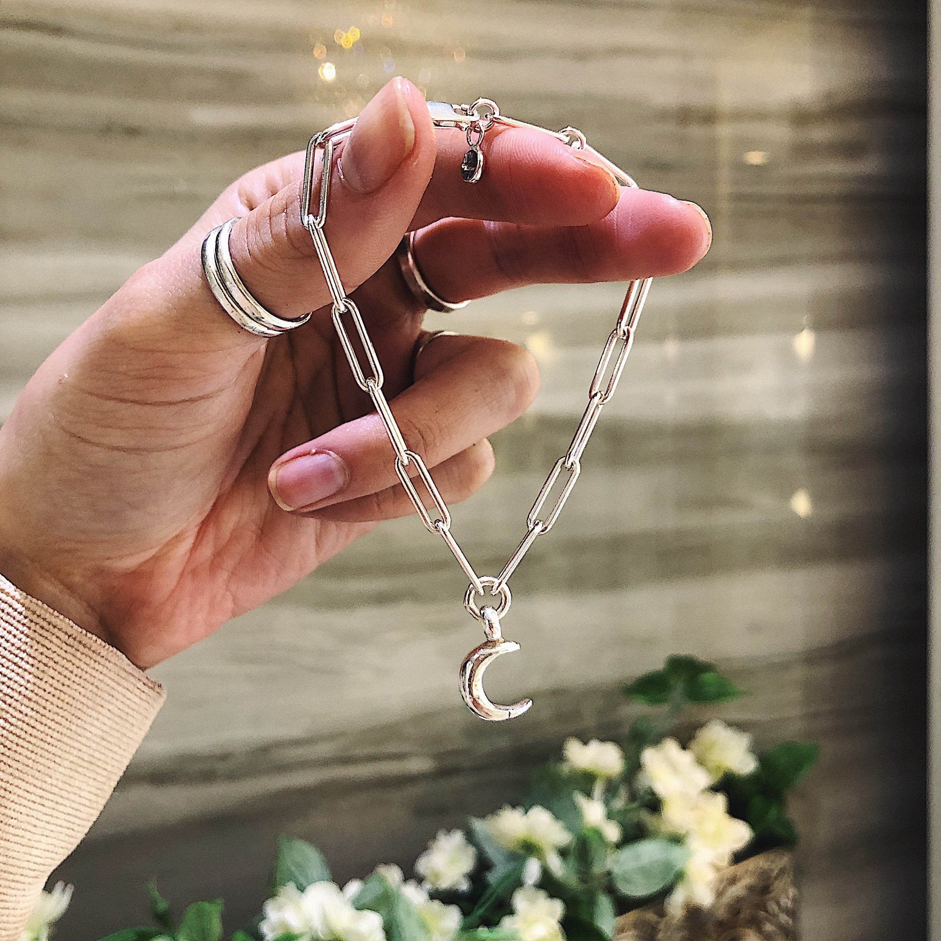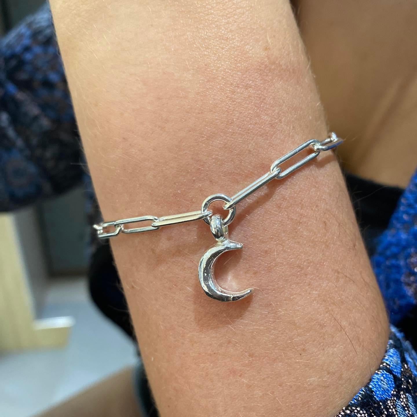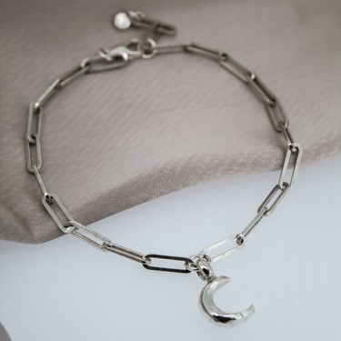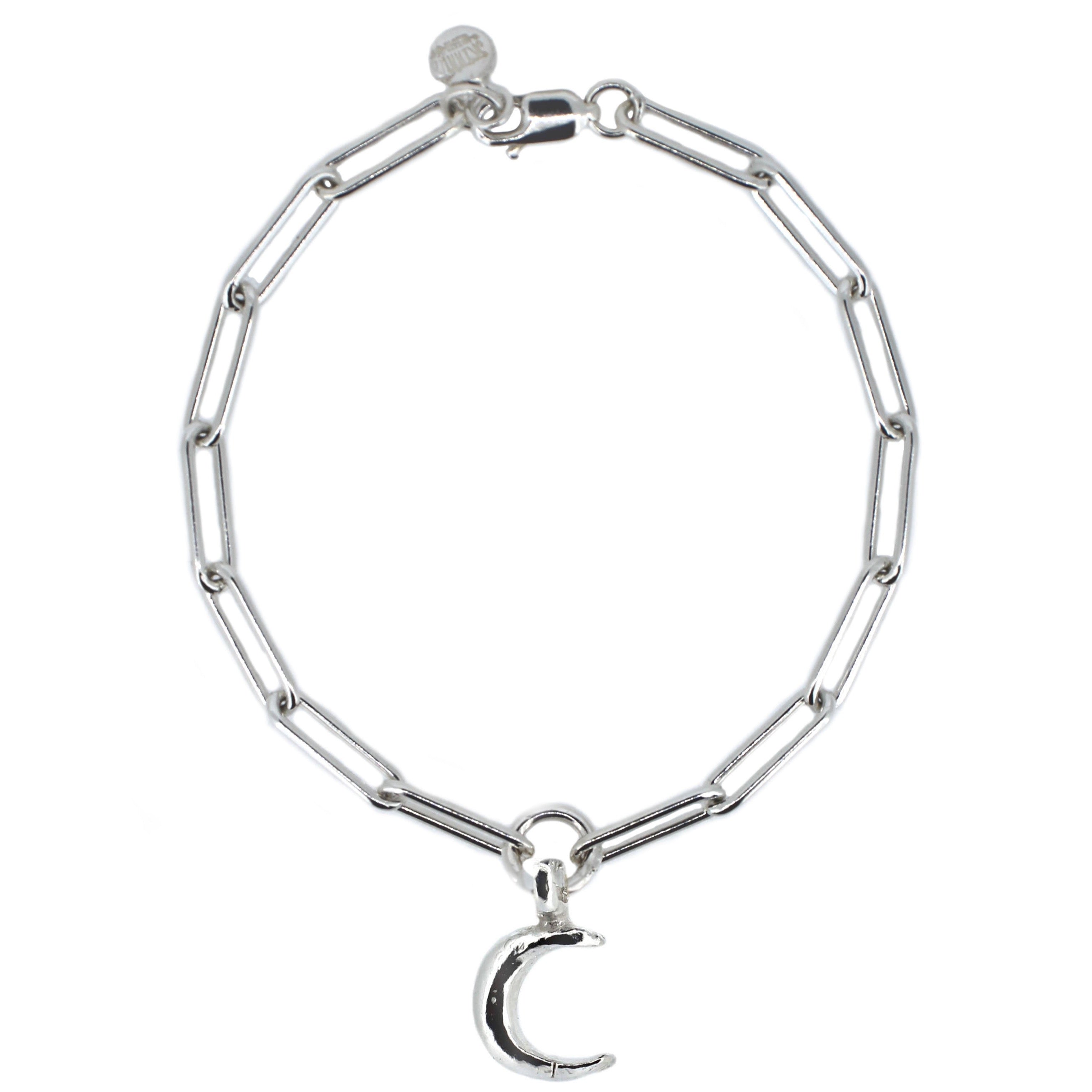Handmade sterling silver trace chain bracelet with Crescent Moon charm.