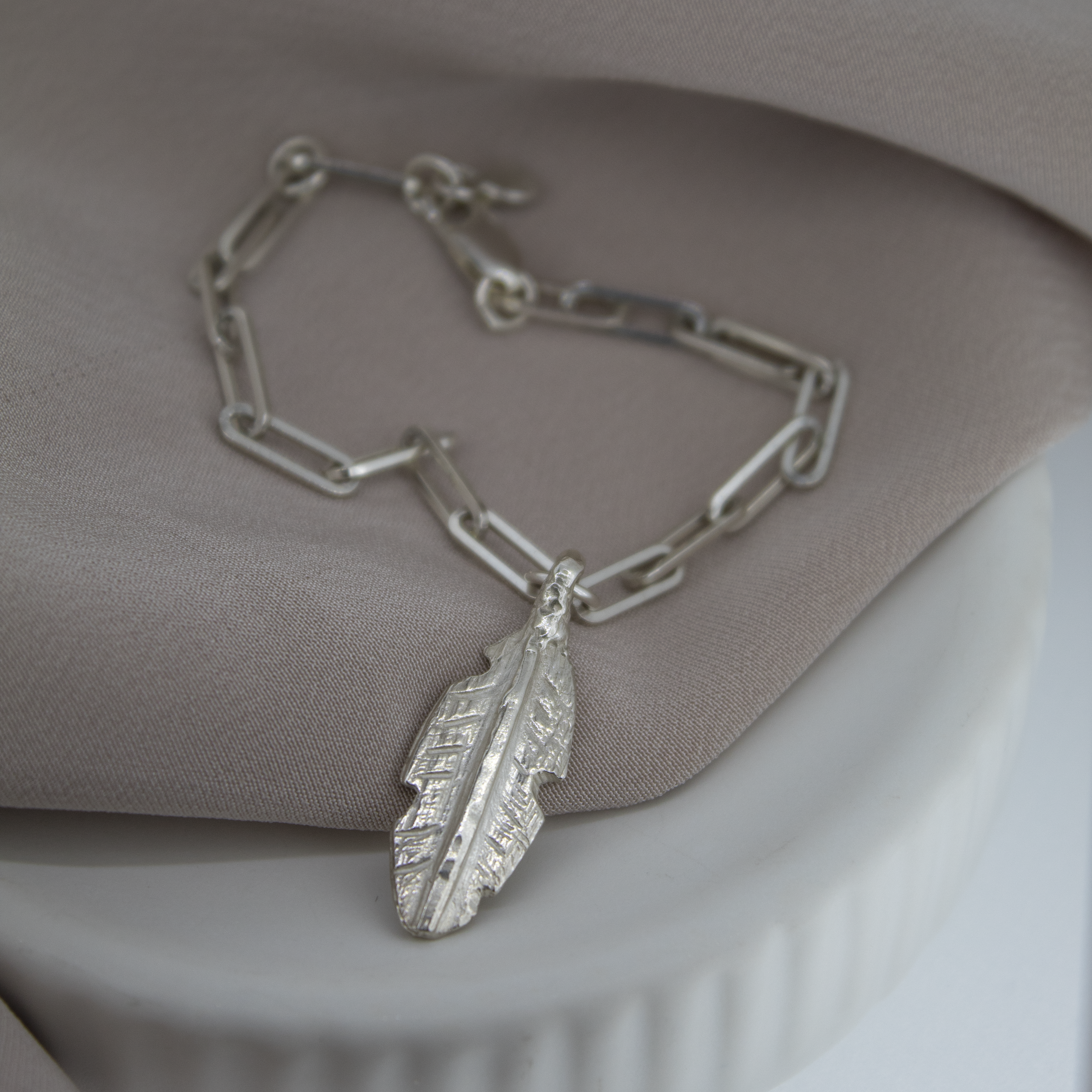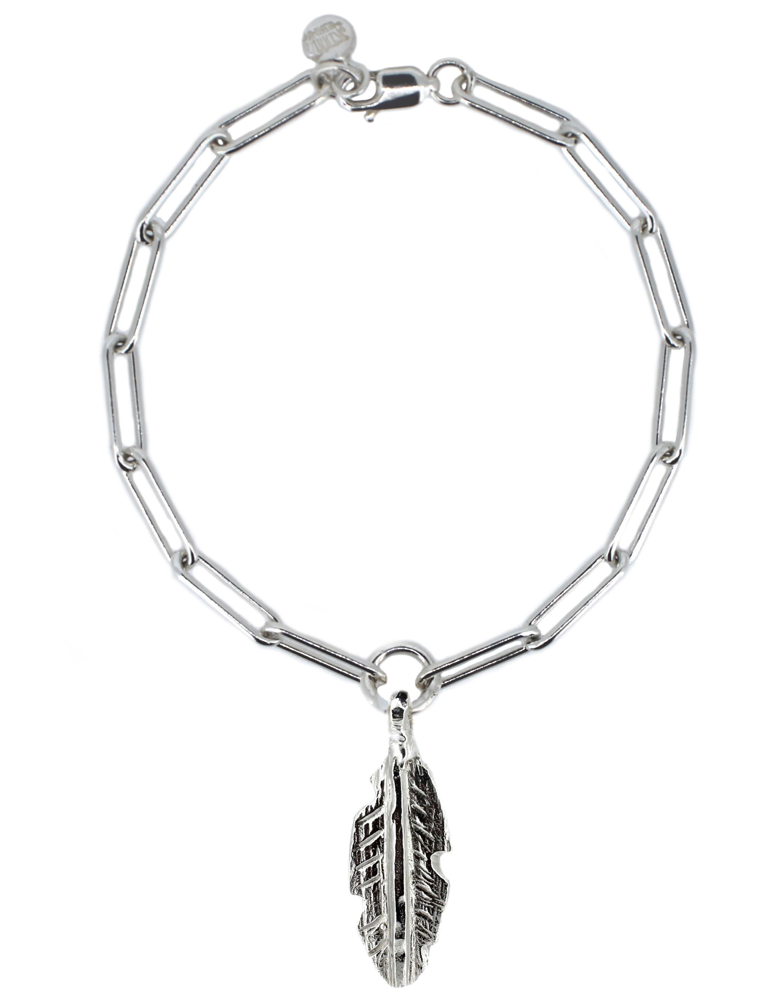 Handmade sterling silver trace chain bracelet with feather charm