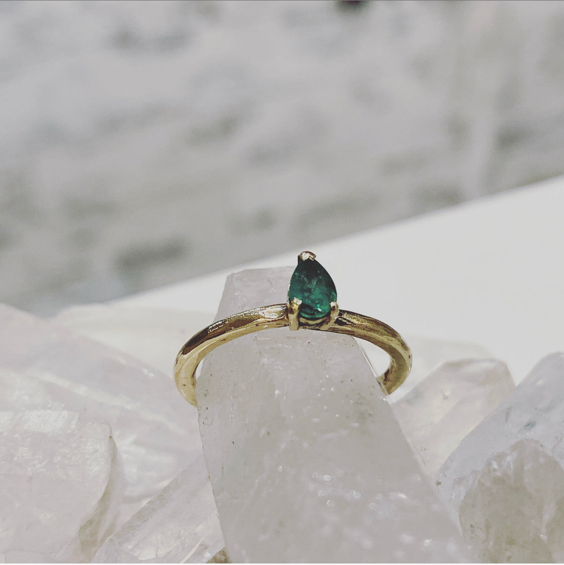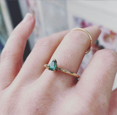 Handmade in 9ct gold this pear shape Emerald has a majestic feel to it.