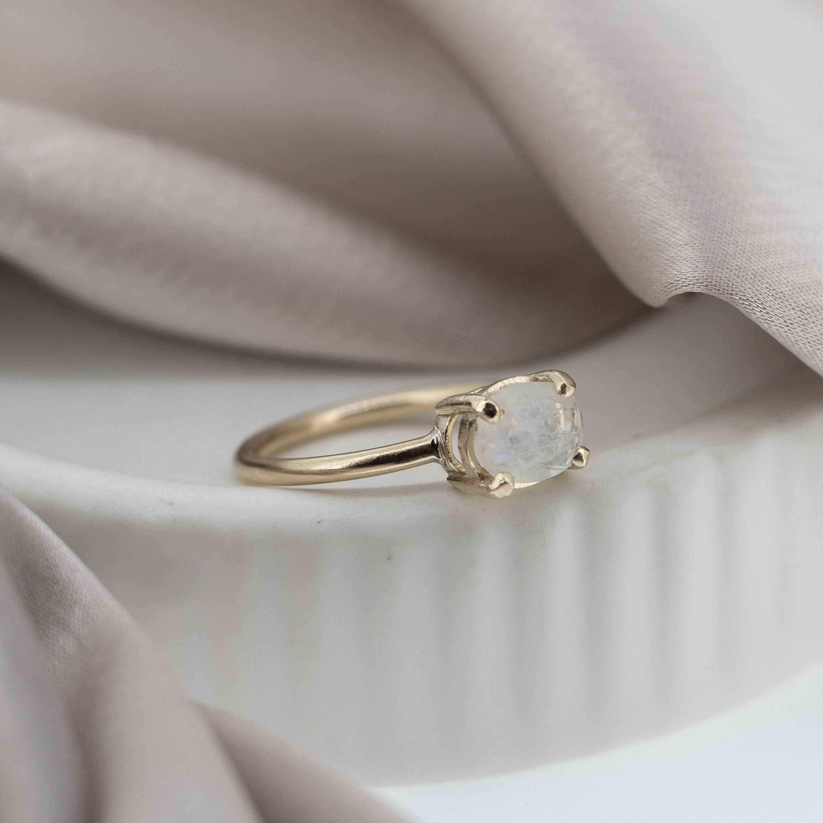 All lovingly made by hand using recycled solid 9ct Gold. A beautiful piece to be worn alone or layered with other staple pieces. Delicate handmade 9ct gold rainbow moon stone ring.