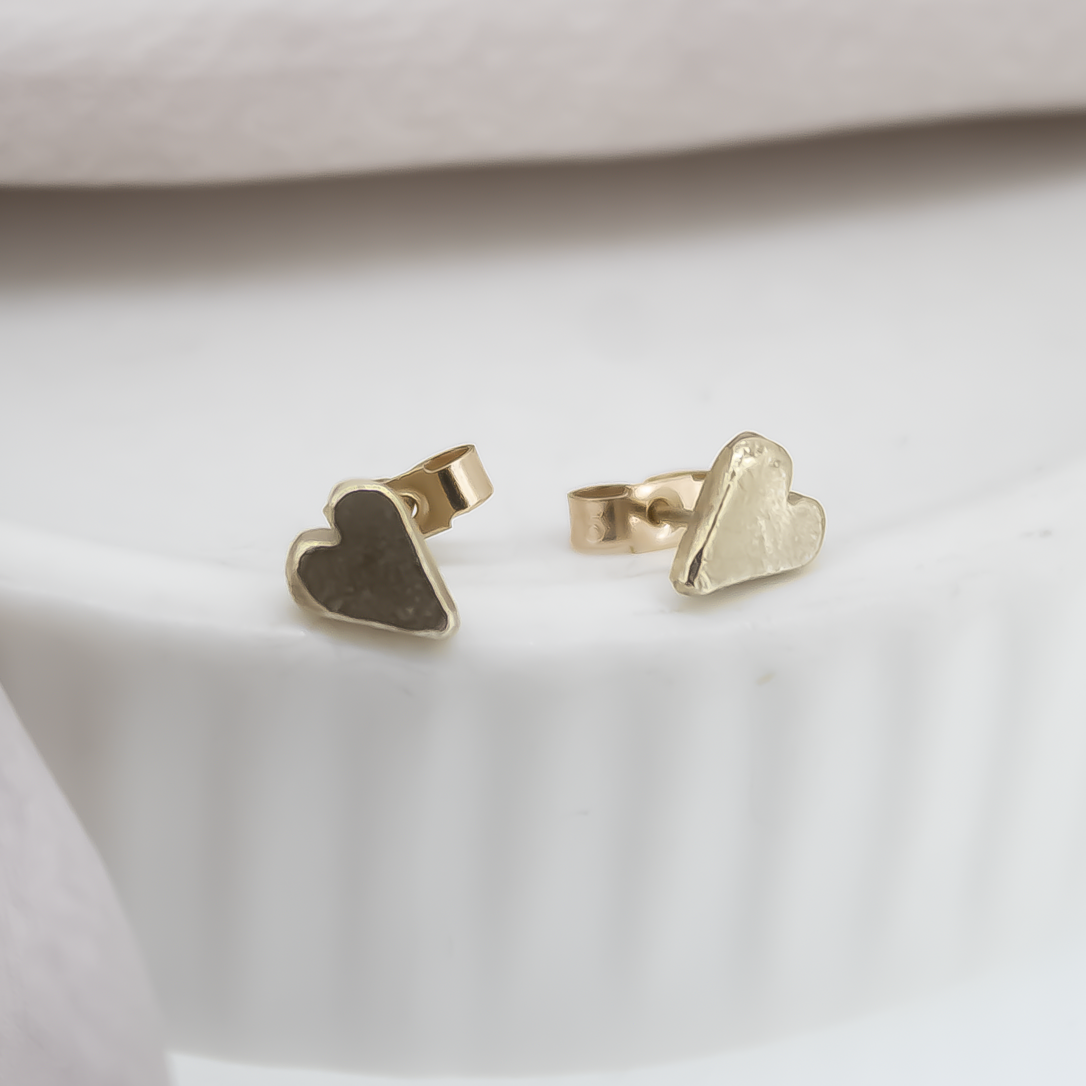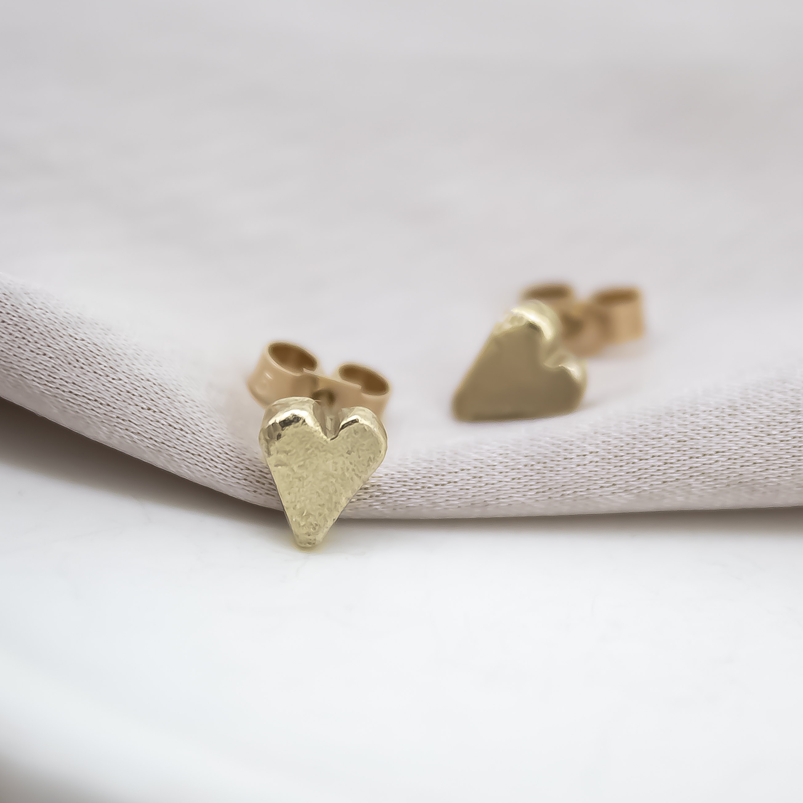 All lovingly made by hand using recycled solid 9ct Gold. A beautiful piece to be worn alone or layered with other staple pieces. Our beautiful rustic baby heart studs in 9ct gold, handmade just for you.